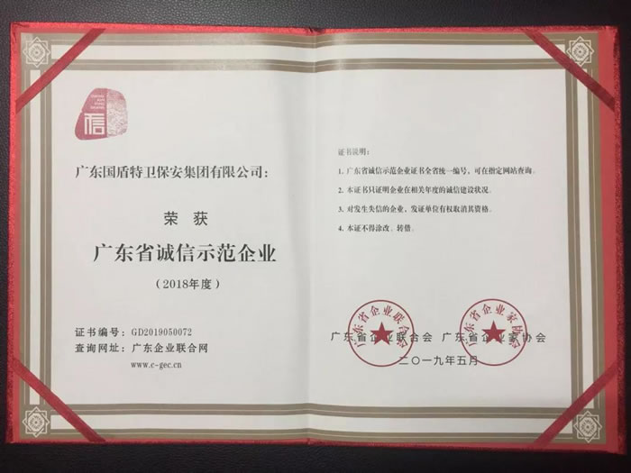 紅5月,廣東國盾特衛保安集團有限公司佳訊連連,因為秉承“守誠信、重服務”的經營理念,并將這一理念扎扎實實的落實到日常工作中去,取得了良好的效果,繼5月23日獲授佛山市信用管理協會、佛山市消費者委員會頒發的《承諾誠信經營企業》牌匾。5月29日由廣東省企業聯合會、廣東省企業家協會主辦的“第25屆廣東省企業家活動日”大會上又傳來佳訊,榮獲《廣東省誠信示范企業》稱號。