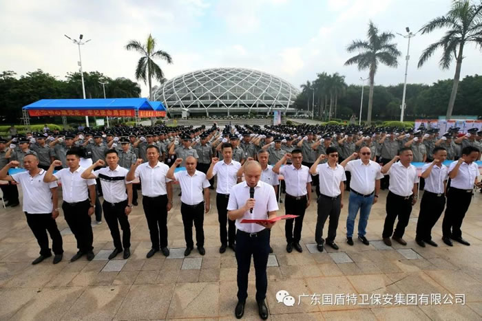 國(guó)盾特衛(wèi)保安集團(tuán)與全市保安代表一起莊嚴(yán)宣誓:“對(duì)黨忠誠(chéng)、服務(wù)人民、履職盡責(zé),不忘初心、牢記使命,以高標(biāo)準(zhǔn)、必勝信心、全力以赴、頑強(qiáng)拼搏,為新中國(guó)成立70周年安保任務(wù),努力奮斗!” ——宣誓人:廣東國(guó)盾特衛(wèi)保安集團(tuán)有限公司全體保安員。