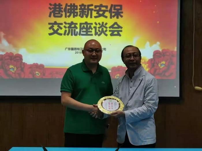 在交流座談會上廣東國盾特衛保安集團有限公司董事長夏學樹先生,亞洲專業保安協會香港分會會長李國柱先生分別介紹了各自的發展歷程,并就雙方共同關心的問題展開坦誠的探討,互贈紀念品。此次訪問交流活動促進了雙方的友誼,雙方表示將進一步拓展合作領域,夯實合作基礎,攜手共同提高。