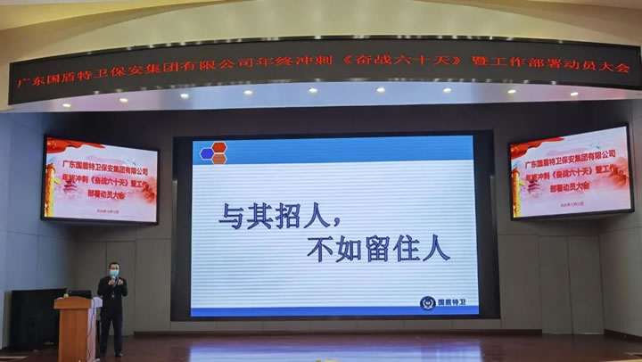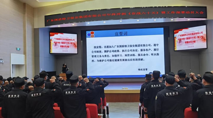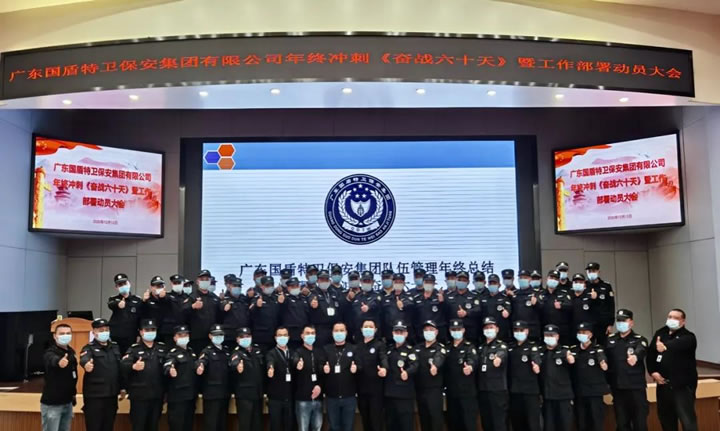 為了確保年末各項工作順利開展,規避各類安全風險事故,夯實基礎管理力量,抓住集團公司發展的重要戰略機遇時期,把客戶安全貫穿到集團公司工作各方面。堅持系統思維,構建大安全格局,全面塑造“國盾特衛”品牌,鑄造一支“素質過硬、服務一流”的精兵強隊,進一步提升客戶單位的服務水平和滿意度,促進集團公司品牌形象建設和可持續健康發展,為客戶單位提供堅強的安全服務保障。 12月12日,集團公司召開隊伍管理年終總結暨年終沖刺奮戰六十天動員大會,集團公司副總經理兼發展管理部部長王延周、服務管理部部長高永旗、行政人事部副部長白雪瑩、各保安部經理、大隊長、分隊長列席會議。