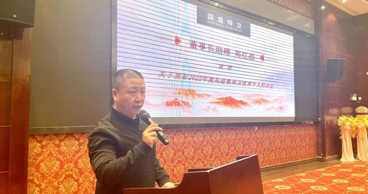 大會在莊嚴(yán)的國歌聲中拉開序幕,會上集團公司副總經(jīng)理王延周同志作《國盾特衛(wèi)保安集團2022年度工作總結(jié)》,圍繞重點項目和任務(wù)、工作亮點等方面總結(jié)成績及經(jīng)驗,正視差距、補齊短板,并對2023年重點工作的規(guī)劃部署進行了匯報。他表示,2023年,要帶領(lǐng)各部門以堅如磐石的信心、堅韌不拔的毅力奮力推進國盾特衛(wèi)安保事業(yè)更上一層樓。