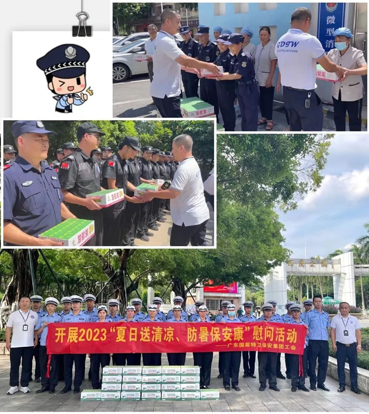 在三水區(qū)總工會、云東海街道黨工委的支持下,為將集團公司對員工的關(guān)心關(guān)愛送到一線,貫徹落實基層一線防暑降溫措施,自7月份起,集團公司工會組織開展“夏日送清涼、防暑保安康”活動,集團公司黨支部書記、董事長夏學(xué)樹親自部署,要求服務(wù)管理部各級管理人員落實傳達公司的關(guān)心關(guān)愛精神,以關(guān)心一線隊員工作和生活為出發(fā)點,各護衛(wèi)點負責(zé)人結(jié)合夏日實際科學(xué)合理安排崗位,叮囑一線隊員加強自我防護,及時補充水分,時刻關(guān)注自身健康狀況,積極投身協(xié)助維護治安、城市管理創(chuàng)文建設(shè)工作中去,繼續(xù)發(fā)揚特別能吃苦、特別能奉獻、特別能戰(zhàn)斗的優(yōu)良作風(fēng),高質(zhì)量做好駐點安保服務(wù)。