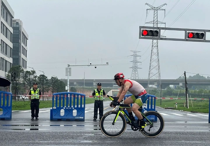 “大鐵人”賽事期間天空陰沉、烏云密布,滂沱大雨傾盆而下。然而,這場不期而至的雨水并沒有澆滅參賽者們的熱情,反而更加激發(fā)了他們的斗志。在賽場各賽段,安保隊員門始終堅守崗位、嚴陣以待,“大鐵人”選手們在雨中激情競逐,保安員們繃緊安全弦,時刻關(guān)注選手和群眾安全。